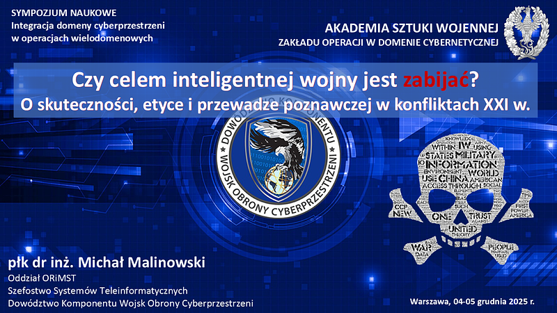 Prezentacja analizuje ewolucję konfliktów zbrojnych – od wojny industrialnej opartej na masie i logistyce, przez wojnę informacyjną zdominowaną przez przepływ danych, aż po współczesną wojnę inteligentną, w której kluczowe znaczenie ma sztuczna inteligencja, autonomia systemów oraz przewaga poznawcza. Autor ukazuje, że współczesne pole walki przesuwa się z obszaru kinetycznego do domeny informacyjno-kognitywnej, gdzie celem staje się kontrola percepcji, emocji i decyzji społeczeństw. Przedstawione przykłady obejmują zarówno użycie nowoczesnych technologii (systemy C4ISR, roje dronów, orbitalny edge computing, architektury Edge–Fog–Cloud–Space), jak i operacje informacyjne – botnety, manipulację narracjami oraz kampanie FIMI. Centralną tezą wystąpienia jest paradoks „inteligentnej wojny”: technologie zwiększają precyzję i ograniczają skalę destrukcji, ale jednocześnie obniżają próg eskalacji konfliktów i wzmacniają presję na dominację informacyjną. Wojna inteligentna nie polega na automatycznym zabijaniu – jej istotą jest zdobycie przewagi decyzyjnej, ochrona własnej infrastruktury poznawczej oraz zdolność wpływania na umysły przeciwnika. W tym kontekście szczególnie istotne staje się rozwijanie kompetencji AI oraz budowanie odporności poznawczej społeczeństw i instytucji państwa. Prezentacja wskazuje, że przyszłe konflikty będą rozstrzygane nie liczbą czołgów, lecz zdolnością państw do integracji algorytmów, ludzi i technologii w spójny system przewagi poznawczej.