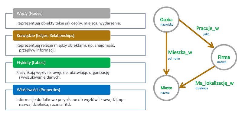 Węzły (Nodes): Reprezentują obiekty takie jak osoby, miejsca, wydarzenia.