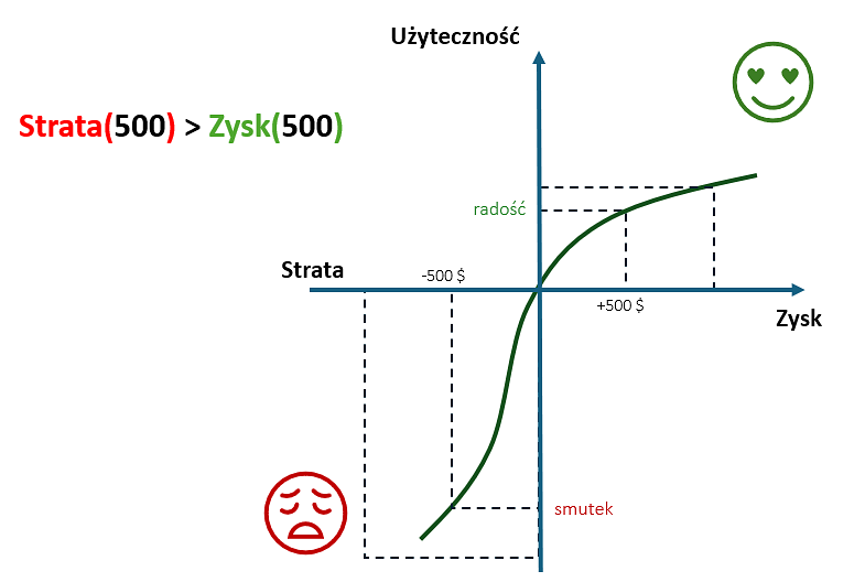 - Dla strat krzywa jest bardziej stroma, co pokazuje, że straty są odczuwane dużo mocniej. Strata 500 zł powoduje większy smutek niż radość z wygrania takiej samej kwoty.
