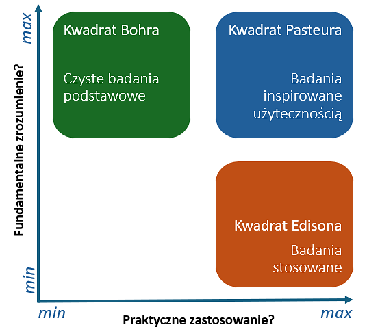 Kwadrat Bohr’a (czysty rozwój wiedzy): Badania motywowane jedynie ciekawością naukową, bez myślenia o ich praktycznym zastosowaniu. Przykładem są badania Nielsa Bohra nad strukturą atomu.