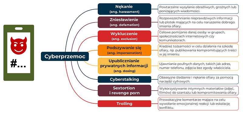 Cyberprzemoc (ang. cyberbullying) to forma przemocy, która ma miejsce w środowisku cyfrowym, głównie za pośrednictwem internetu i urządzeń mobilnych. Polega na celowym i powtarzalnym działaniu mającym na celu zaszkodzenie drugiej osobie, często w sposób trudny do wykrycia i udowodnienia. Cyberprzemoc jest szczególnie niebezpieczna, ponieważ może mieć trwały wpływ na zdrowie psychiczne ofiary i jest trudna do kontrolowania z uwagi na anonimowość sprawców oraz szybkość rozprzestrzeniania się informacji w sieci.