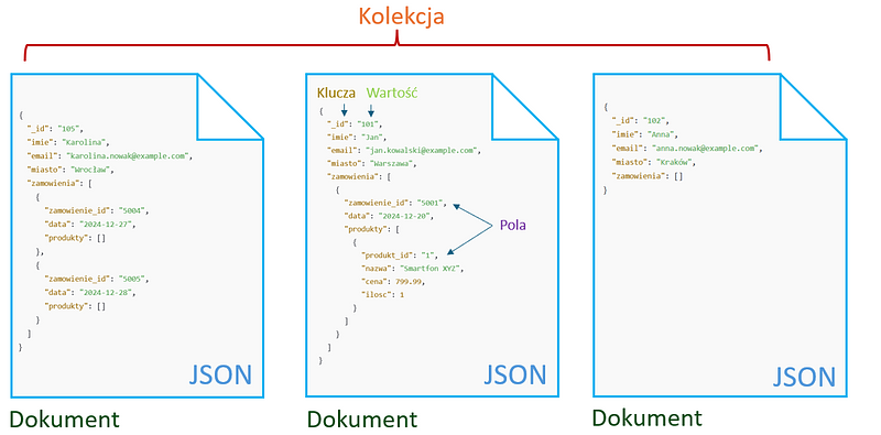Każdy dokument zawiera złożone dane, takie jak tablice zamówień czy zagnieżdżone listy produktów, co znacząco upraszcza ich przechowywanie i zarządzanie w porównaniu do relacyjnych baz danych.