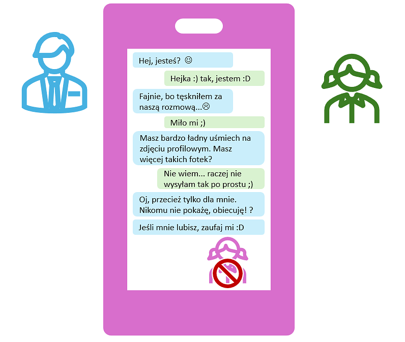 Budowanie zaufania: sprawca często udaje rówieśnika, chwali, okazuje zainteresowanie, dzieli się „tajemnicami”, by stworzyć emocjonalną więź.