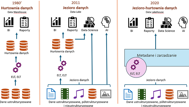 Systemy do magazynowania danych przeszły długą drogę – od wyspecjalizowanych hurtowni z zaczepionym modelem „schema-on-write”, przez surowe jeziora danych, aż po hybrydowe lakehouse’y, które łączą oba światy. Poniższy przegląd opiera się na trzech kluczowych etapach rozwoju: latach 80' XX wieku, 2011 i 2020.