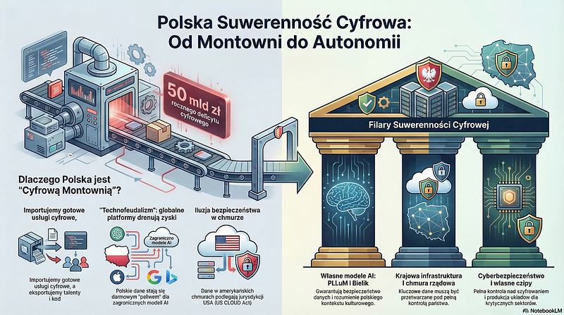 Obecna sytuacja Polski jest trudna. Mimo świetnych programistów, mamy najniższą produktywność pracy w sektorze ICT w całej Unii Europejskiej. Funkcjonujemy jako zaplecze usługowe dla zachodnich korporacji. Co gorsza, nasz deficyt w handlu produktami cyfrowymi (chmura, reklama, licencje) wynosi już ok. 50 mld zł rocznie. Prognozy są niepokojące: do 2030 roku będziemy importować więcej produktów cyfrowych niż paliw kopalnych.