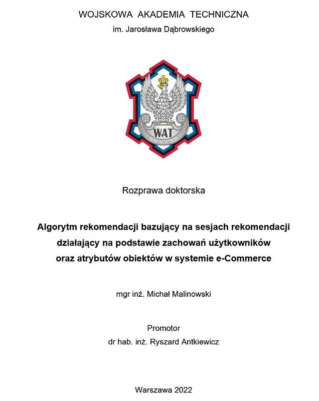 Malinowski, M. (2022). Algorytm rekomendacji bazujący na sesjach rekomendacji działający na podstawie zachowań użytkowników oraz atrybutów obiektów w systemie e-Commerce (PhD thesis). Wojskowa Akademia Techniczna.