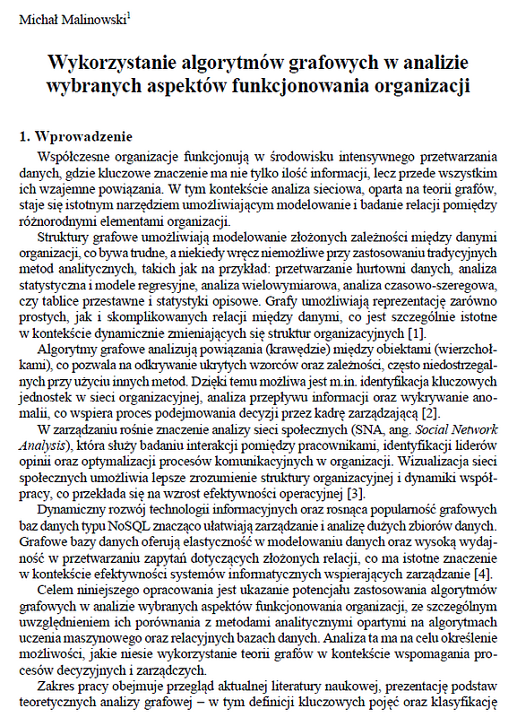 Współczesne organizacje funkcjonują w środowisku intensywnego przetwarzania danych, gdzie kluczowe znaczenie ma analiza powiązań między elementami strukturalnymi. W odpowiedzi na potrzebę lepszego modelowania złożonych relacji organizacyjnych, w opracowaniu przedstawiono zastosowanie algorytmów grafowych w kontekście zarządzania i analizy funkcjonowania organizacji. Celem badania było ukazanie możliwości wykorzystania technik grafowych do identyfikacji kluczowych jednostek, optymalizacji procesów decyzyjnych oraz wykrywania nieprawidłowości w strukturach organizacyjnych. Przeprowadzona analiza obejmuje przegląd literatury, omówienie najczęściej stosowanych algorytmów grafowych oraz prezentację wybranych przykładów zastosowania tych technik w praktyce organizacyjnej. Zastosowano algorytmy centralności, klasteryzacji, predykcji relacji oraz detekcji anomalii, co pozwoliło na skuteczne modelowanie sieci powiązań oraz identyfikację potencjalnych problemów w przepływie informacji. Wyniki potwierdzają efektywność analiz grafowych w usprawnianiu procesów decyzyjnych oraz w zarządzaniu ryzykiem. Podsumowując, wykorzystanie algorytmów grafowych w analizie organizacyjnej stanowi perspektywiczną metodę wspierania zarządzania, szczególnie w kontekście dużych struktur danych oraz dynamicznie zmieniających się relacji w organizacjach. Przyszłe badania powinny skupić się na integracji grafowych metod analitycznych z technikami uczenia maszynowego oraz na analizie w czasie rzeczywistym.