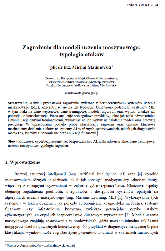 Malinowski, Michał. “Zagrożenia Dla Modeli Uczenia Maszynowego: Typologia Ataków.” In CyberEXPERT 2024 AI i QUANTUM COMPUTING W UNIKALNEJ SYNERGII DLA CYBERBEZPIECZEŃSTWA, edited by Mariusz Krawczyk, 61–105. WYDAWNICTWO POLITECHNIKI ŚLĄSKIEJ, 2025.